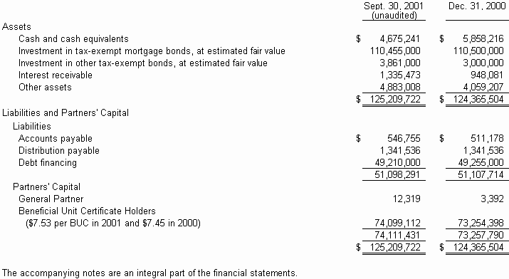 The aggregate carrying value of the tax-exempt mortgage bonds at September 30, 2001 was $110,455,000. The carrying value of the bonds reflects the general partner's estimate of the fair value of such bonds. As of September 30, 2001, the Partnership has pledged a total of $87,786,000 of its tax-exempt mortgage bond portfolio in connection with securitizations of its tax-exempt mortgage bonds as described herein. In addition, the Partnership pledged $4,000,000 of its tax-exempt mortgage bond portfolio in connection with a standby reimbursement agreement as more fully described below.