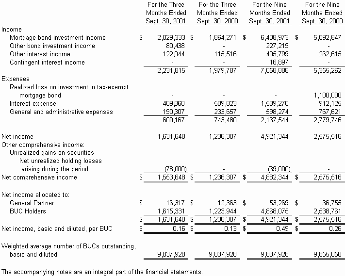 In addition to cash generated from interest income, the Partnership may draw on its reserve to pay operating expenses or to supplement cash distributions to BUC holders. As of September 30, 2001, the amount held by the Partnership in the reserve was $5,158,522. During the nine months ended September 30, 2001, undistributed income totaling $892,640 ($290,112 for the three months ended September 30, 2001) was placed into reserves. Future distributions to BUC holders will depend upon the amount of base and contingent interest received on the mortgage bonds, the size of the reserves established by the Partnership and the extent to which withdrawals are made from reserves.