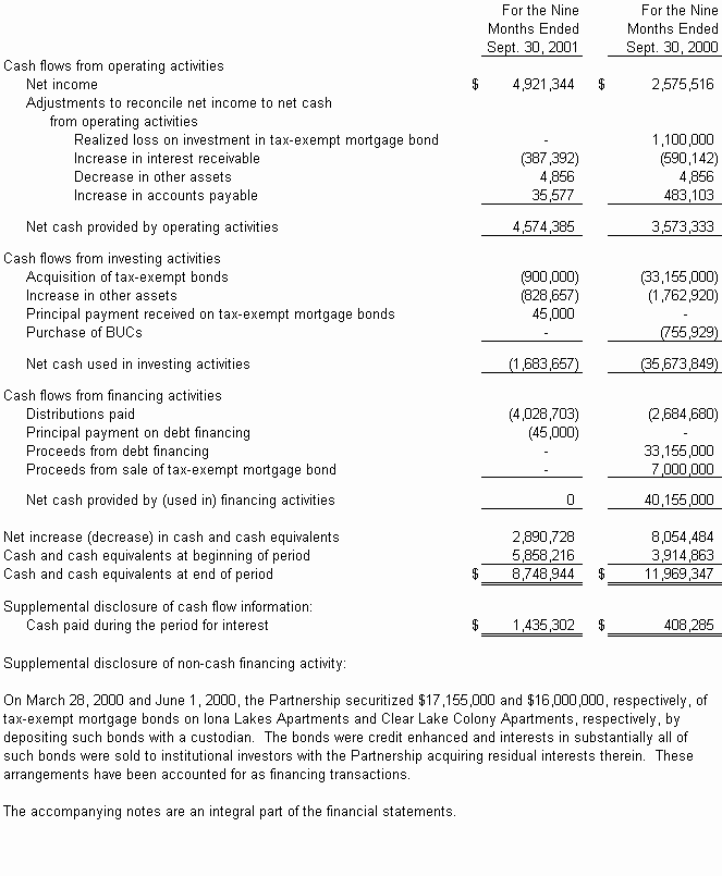 During the nine months ended September 30, 2001, the Partnership incurred interest expense of $1,539,270 on the $49,210,000 of debt financing obtained in connection with securitizing certain of its tax-exempt mortgage bonds. For the comparable period of 2000, the Partnership incurred interest expense of $912,125 on $38,155,000 of debt financing (of which $17,155,000 and $16,000,000 were acquired in March and June of 2000, respectively). Accordingly, interest expense increased $627,145 (69%) for the nine months ended September 30, 2001, compared to the comparable period of 2000. Such rates averaged 4.18% for the nine months ended September 30, 2001 compared to 4.38% for the comparable period of 2000.