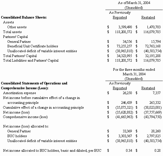 The following consolidating schedule presents restated information about the Partnership, the VIEs and the effects of their consolidation as of and for the three months ended March 31, 2004: