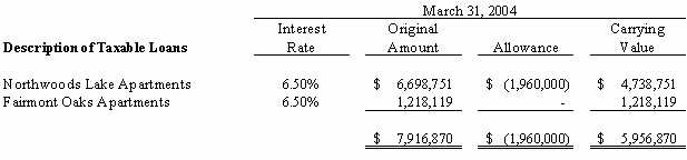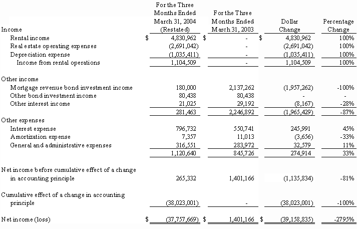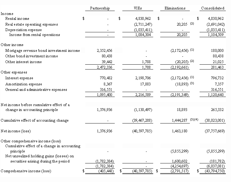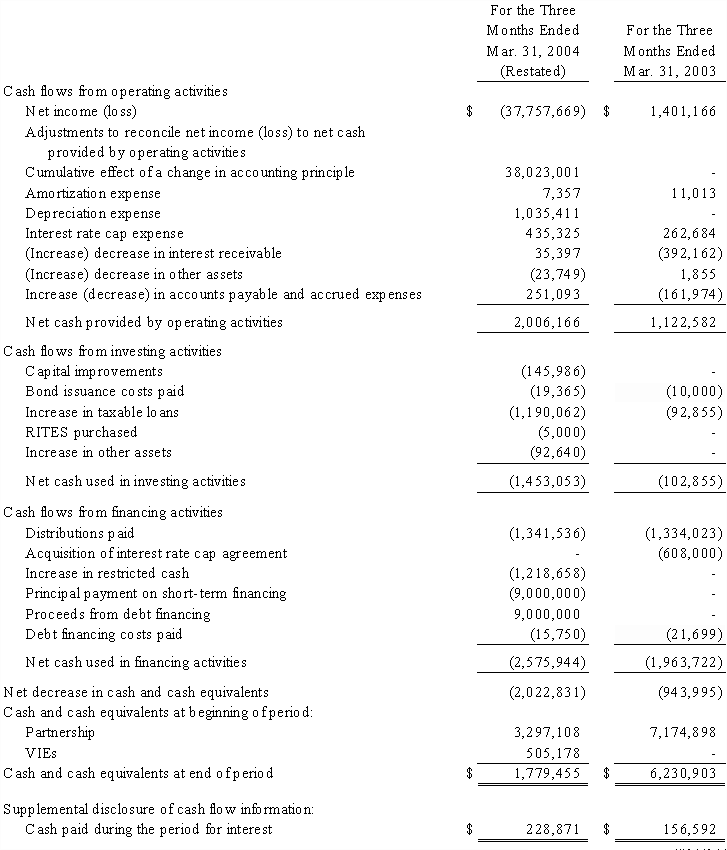 During the second quarter of 2004, the Company discovered a bookkeeping error in the consolidation of VIEs related to the implementation of FIN 46R. In the consolidation, the tax-exempt mortgage revenue bonds owned by the Partnership and owed by the VIEs are eliminated. Certain deferred financing costs related to the eliminated bonds were not identified and thus were not eliminated in the initial implementation of FIN 46R as of January 1, 2004. As a result, the financial results as of and for the three month period ended March 31, 2004 are being restated. While the restatement adjustments impact net income (loss) of the Company, they do not impact the cash flows from operating, investing or financing activities. The previously reported amounts and the restated amounts for the first quarter of 2004 are as follows: