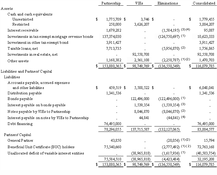 The Partnership's maximum exposure to loss from these VIEs is represented by the tax-exempt mortgage revenue bonds owned by the Partnership and taxable loans made by the Partnership to the properties. The following tables provide information regarding the tax-exempt mortgage revenue bonds and the taxable loans which have been eliminated in the consolidation of the VIEs.