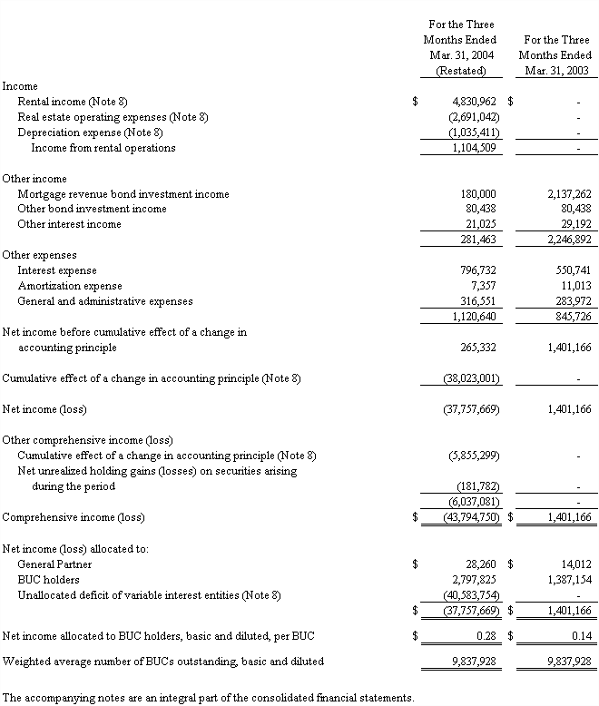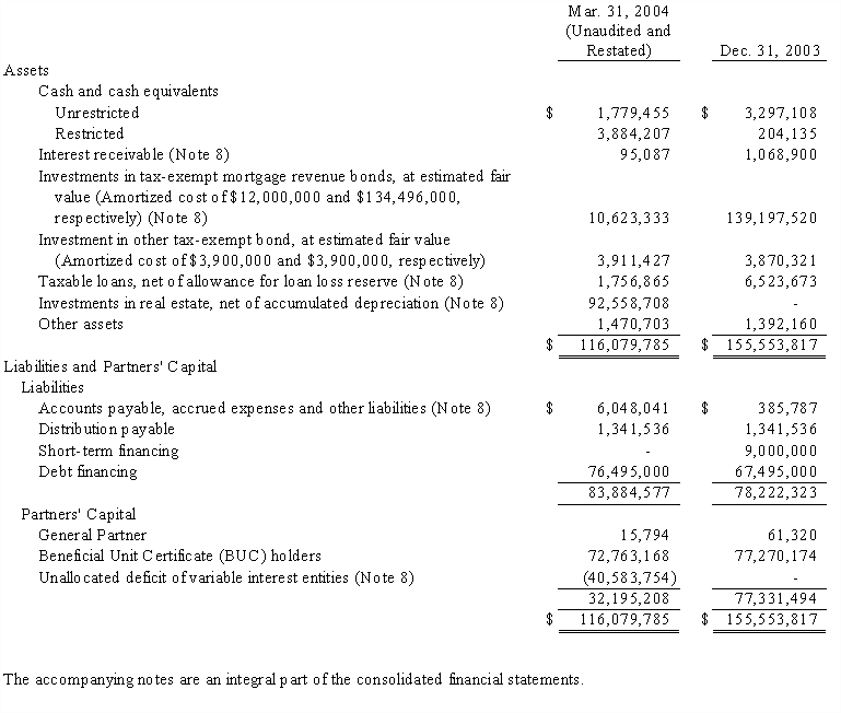 During the second quarter of 2004, the Company discovered a bookkeeping error in the consolidation of variable interest entities ("VIEs") related to the implementation of Financial Accounting Standards Board Interpretation No. 46, Consolidation of Variable Interest Entities an interpretation of ARB 51 (Revised December 2003) ("FIN 46R"). In the consolidation, the tax-exempt mortgage revenue bonds owned by the Partnership and owed by the VIEs are eliminated. Certain deferred financing costs related to the eliminated bonds were not identified and thus were not eliminated in the initial implementation of FIN 46R as of January 1, 2004. As a result, the financial results as of and for the three month period ended March 31, 2004 are being restated. While the restatement adjustments impact net income (loss) of the Company, they do not impact the cash flows from operating, investing or financing activities. The previously reported amounts and the restated amounts for the first quarter of 2004 are as follows: