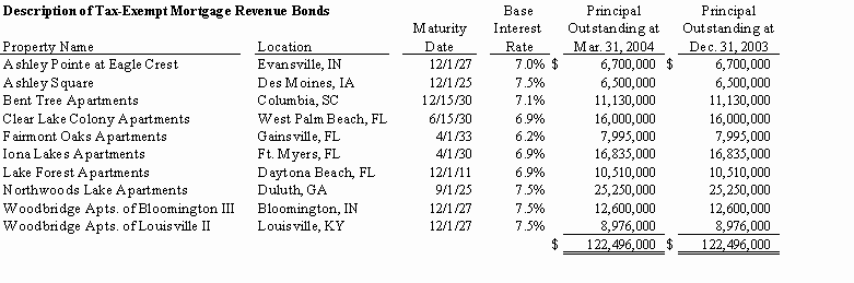 Mortgage revenue bond investment income. Mortgage revenue bond investment income increased due to: (i) earnings of base interest on the Chandler Creek Apartments bond which was acquired in December 2003; (ii) the Fairmont Oaks Apartments bond which was acquired in April 2003; partially offset by (iii) a decrease in past-due base interest earned on the Woodbridge Apartments of Bloomington and Louisville tax-exempt mortgage revenue bonds.