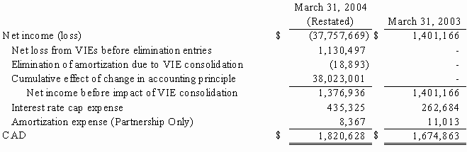 Interest rate cap expense, which is the result of marking the interest rate cap agreements to market, was $435,325 and $262,684 for the three month periods ended March 31, 2004 and 2003, respectively, and is included as a component of interest expense in the accompanying financial statements.