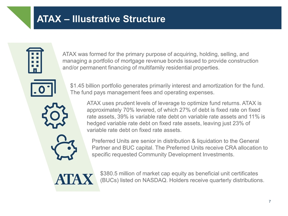 ATAX – Illustrative Structure ATAX was formed for the primary purpose of acquiring, holding, selling, and managing a portfolio of mortgage revenue bonds issued to provide construction and/or permanent financing of multifamily residential properties. $1.45 billion portfolio generates primarily interest and amortization for the fund. The fund pays management fees and operating expenses. ATAX uses prudent levels of leverage to optimize fund returns. ATAX is approximately 70% levered, of which 27% of debt is fixed rate on fixed rate assets, 39% is variable rate debt on variable rate assets and 11% is hedged variable rate debt on fixed rate assets, leaving just 23% of variable rate debt on fixed rate assets. Preferred Units are senior in distribution & liquidation to the General Partner and BUC capital. The Preferred Units receive CRA allocation to specific requested Community Development Investments. $380.5 million of market cap equity as beneficial unit certificates (BUCs) listed on NASDAQ. Holders receive quarterly distributions.