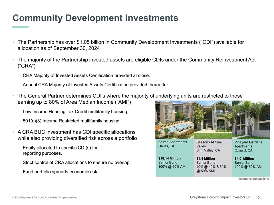 CRA Allocation & Exit Methodology Issuance • At close, Investor will receive newly issued CRA BUCs which will be matched with CRA allocation requests. CRA Allocation • CRA allocation requests are captured in the subscription agreement. The investor will receive a letter of CRA allocation and statement of non-overlap matching the CRA allocation requests. Transfer Agent • CRA BUCs will be registered in the Investor’s name on the Partnership’s BUC holder records and held in the Investor’s name at the Partnership’s transfer agent in book-entry form, to ensure accurate recording of capital invested and allocation to CRA investments. Market Liquidity • CRA BUCs are offered under an effective Form S-3 Registration Statement and will be approved for listing on the NYSE. • The CRA BUCs will be freely tradable by Investors. Any transfer or sale of the CRA BUCs out of the Investor’s holding account at the transfer agent will result in the loss of the Investor’s CRA allocation. Remaining CRA allocations will be prorated across current allocations at that time. Investor will receive an updated CRA allocation letter. © 2024 Greystone & Co. II LLC. Confidential. All rights reserved. Greystone Housing Impact Investors LP 9