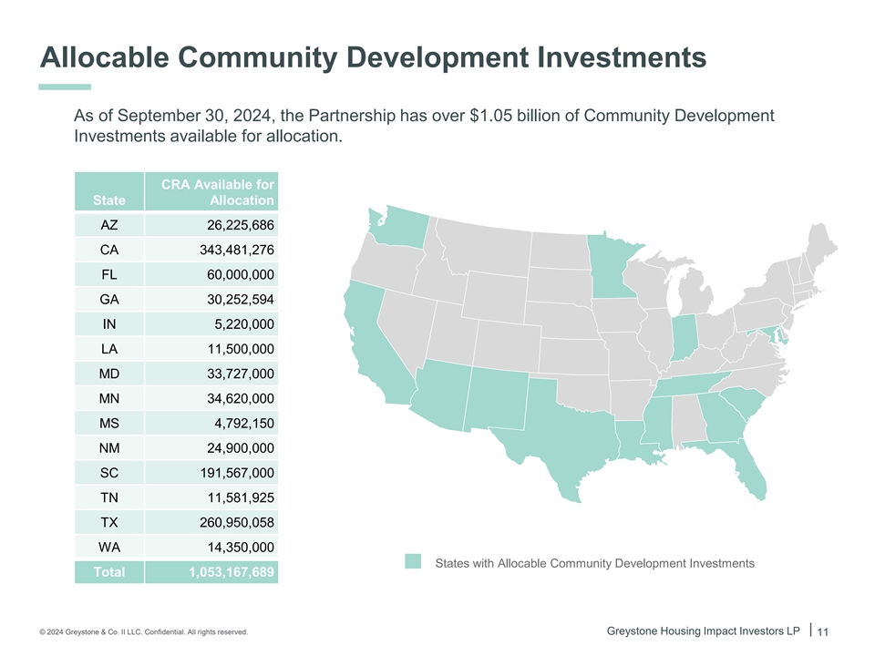 Allocable Community Development Investments As of September 30, 2024, the Partnership has over $1.05 billion of Community Development Investments available for allocation. CRA Available for State Allocation AZ 26,225,686 CA 343,481,276 FL 60,000,000 GA 30,252,594 IN 5,220,000 LA 11,500,000 MD 33,727,000 MN 34,620,000 MS 4,792,150 NM 24,900,000 SC 191,567,000 TN 11,581,925 TX 260,950,058 WA 14,350,000 States with Allocable Community Development Investments Total 1,053,167,689 © 2024 Greystone & Co. II LLC. Confidential. All rights reserved. Greystone Housing Impact Investors LP 11