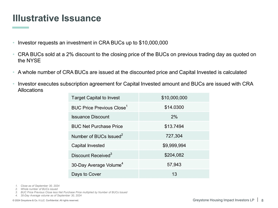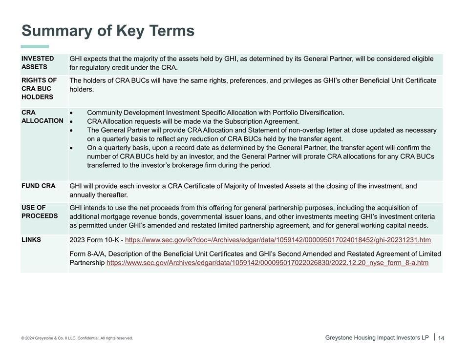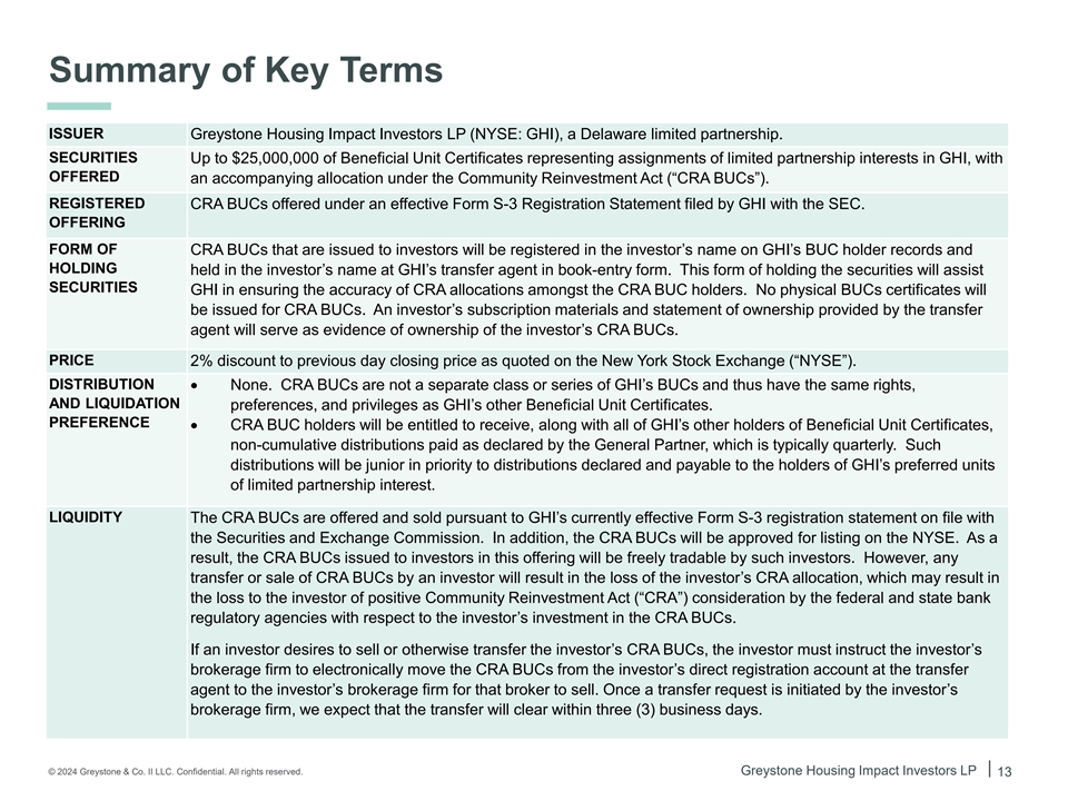 Summary of Key Terms ISSUER Greystone Housing Impact Investors LP (NYSE: GHI), a Delaware limited partnership. SECURITIES Up to $25,000,000 of Beneficial Unit Certificates representing assignments of limited partnership interests in GHI, with OFFERED an accompanying allocation under the Community Reinvestment Act (“CRA BUCs”). REGISTERED CRA BUCs offered under an effective Form S-3 Registration Statement filed by GHI with the SEC. OFFERING FORM OF CRA BUCs that are issued to investors will be registered in the investor’s name on GHI’s BUC holder records and HOLDING held in the investor’s name at GHI’s transfer agent in book-entry form. This form of holding the securities will assist SECURITIES GHI in ensuring the accuracy of CRA allocations amongst the CRA BUC holders. No physical BUCs certificates will be issued for CRA BUCs. An investor’s subscription materials and statement of ownership provided by the transfer agent will serve as evidence of ownership of the investor’s CRA BUCs. PRICE 2% discount to previous day closing price as quoted on the New York Stock Exchange (“NYSE”). DISTRIBUTION • None. CRA BUCs are not a separate class or series of GHI’s BUCs and thus have the same rights, AND LIQUIDATION preferences, and privileges as GHI’s other Beneficial Unit Certificates. PREFERENCE • CRA BUC holders will be entitled to receive, along with all of GHI’s other holders of Beneficial Unit Certificates, non-cumulative distributions paid as declared by the General Partner, which is typically quarterly. Such distributions will be junior in priority to distributions declared and payable to the holders of GHI’s preferred units of limited partnership interest. LIQUIDITY The CRA BUCs are offered and sold pursuant to GHI’s currently effective Form S-3 registration statement on file with the Securities and Exchange Commission. In addition, the CRA BUCs will be approved for listing on the NYSE. As a result, the CRA BUCs issued to investors in this offering will be freely tradable by such investors. However, any transfer or sale of CRA BUCs by an investor will result in the loss of the investor’s CRA allocation, which may result in the loss to the investor of positive Community Reinvestment Act (“CRA”) consideration by the federal and state bank regulatory agencies with respect to the investor’s investment in the CRA BUCs. If an investor desires to sell or otherwise transfer the investor’s CRA BUCs, the investor must instruct the investor’s brokerage firm to electronically move the CRA BUCs from the investor’s direct registration account at the transfer agent to the investor’s brokerage firm for that broker to sell. Once a transfer request is initiated by the investor’s brokerage firm, we expect that the transfer will clear within three (3) business days. © 2024 Greystone & Co. II LLC. Confidential. All rights reserved. Greystone Housing Impact Investors LP 13