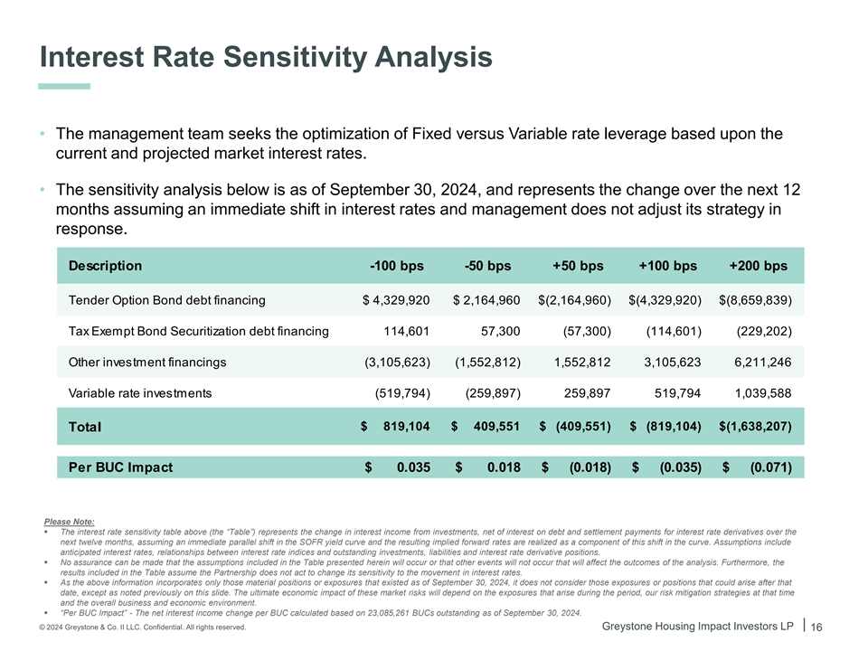 Interest Rate Sensitivity Analysis • The management team seeks the optimization of Fixed versus Variable rate leverage based upon the current and projected market interest rates. • The sensitivity analysis below is as of September 30, 2024, and represents the change over the next 12 months assuming an immediate shift in interest rates and management does not adjust its strategy in response. Description -100 bps -50 bps +50 bps +100 bps +200 bps Tender Option Bond debt financing $ 4,329,920 $ 2,164,960 $(2,164,960) $(4,329,920) $(8,659,839) Tax Exempt Bond Securitization debt financing 114,601 57,300 (57,300) (114,601) (229,202) Other investment financings (3,105,623) (1,552,812) 1,552,812 3,105,623 6,211,246 Variable rate investments (519,794) (259,897) 259,897 519,794 1,039,588 $ 819,104 $ 409,551 $ (409,551) $ (819,104) $(1,638,207) Total Per BUC Impact $ 0.035 $ 0.018 $ (0.018) $ (0.035) $ (0.071) Please Note: § The interest rate sensitivity table above (the “Table”) represents the change in interest income from investments, net of interest on debt and settlement payments for interest rate derivatives over the next twelve months, assuming an immediate parallel shift in the SOFR yield curve and the resulting implied forward rates are realized as a component of this shift in the curve. Assumptions include anticipated interest rates, relationships between interest rate indices and outstanding investments, liabilities and interest rate derivative positions. § No assurance can be made that the assumptions included in the Table presented herein will occur or that other events will not occur that will affect the outcomes of the analysis. Furthermore, the results included in the Table assume the Partnership does not act to change its sensitivity to the movement in interest rates. § As the above information incorporates only those material positions or exposures that existed as of September 30, 2024, it does not consider those exposures or positions that could arise after that date, except as noted previously on this slide. The ultimate economic impact of these market risks will depend on the exposures that arise during the period, our risk mitigation strategies at that time and the overall business and economic environment. § “Per BUC Impact” - The net interest income change per BUC calculated based on 23,085,261 BUCs outstanding as of September 30, 2024. © 2024 Greystone & Co. II LLC. Confidential. All rights reserved. Greystone Housing Impact Investors LP 16