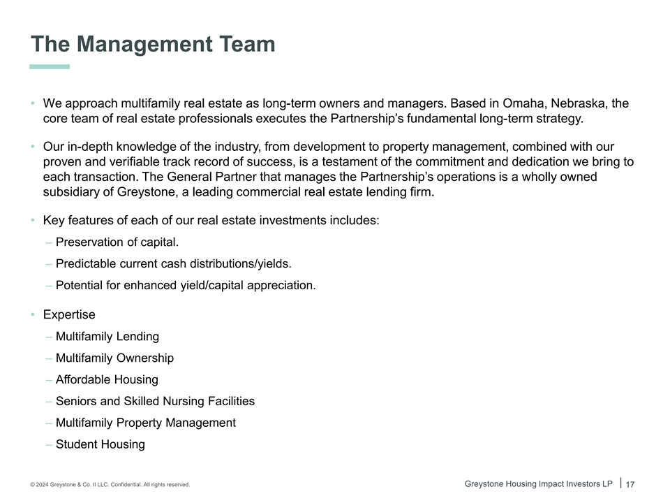 The Management Team • We approach multifamily real estate as long-term owners and managers. Based in Omaha, Nebraska, the core team of real estate professionals executes the Partnership’s fundamental long-term strategy. • Our in-depth knowledge of the industry, from development to property management, combined with our proven and verifiable track record of success, is a testament of the commitment and dedication we bring to each transaction. The General Partner that manages the Partnership’s operations is a wholly owned subsidiary of Greystone, a leading commercial real estate lending firm. • Key features of each of our real estate investments includes: ‒ Preservation of capital. ‒ Predictable current cash distributions/yields. ‒ Potential for enhanced yield/capital appreciation. • Expertise ‒ Multifamily Lending ‒ Multifamily Ownership ‒ Affordable Housing ‒ Seniors and Skilled Nursing Facilities ‒ Multifamily Property Management ‒ Student Housing © 2024 Greystone & Co. II LLC. Confidential. All rights reserved. Greystone Housing Impact Investors LP 17