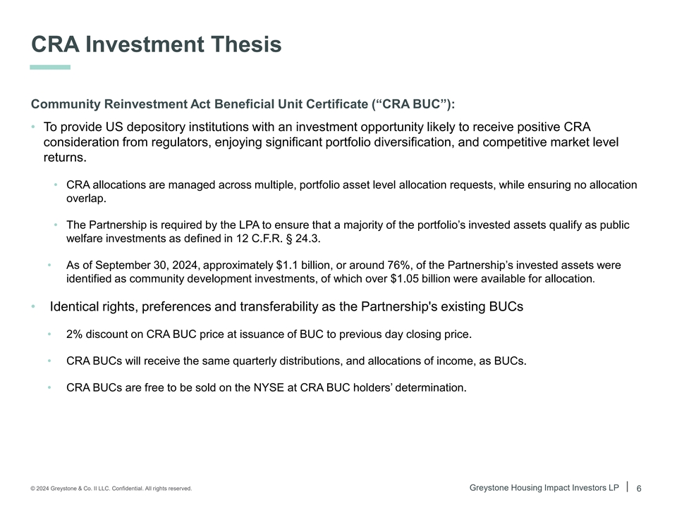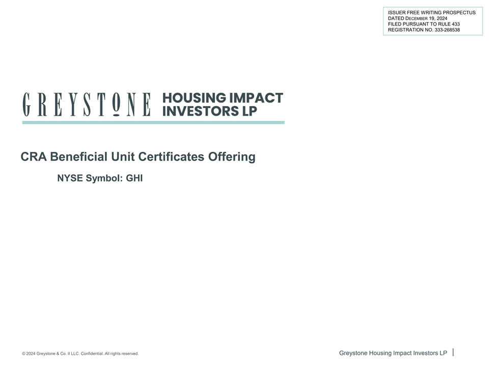 ISSUER FREE WRITING PROSPECTUS DATED DECEMBER 19, 2024 FILED PURSUANT TO RULE 433 REGISTRATION NO. 333-268538 CRA Beneficial Unit Certificates Offering NYSE Symbol: GHI © 2024 Greystone & Co. II LLC. Confidential. All rights reserved. Greystone Housing Impact Investors LP