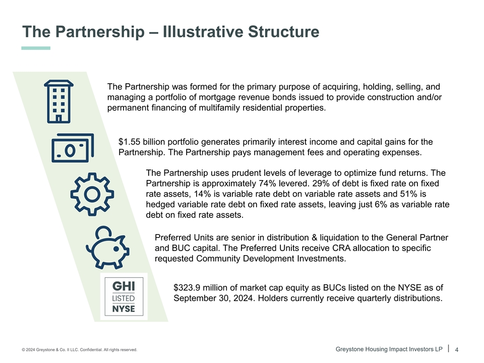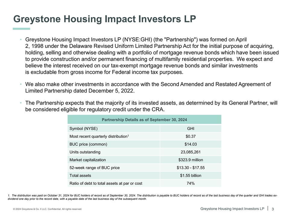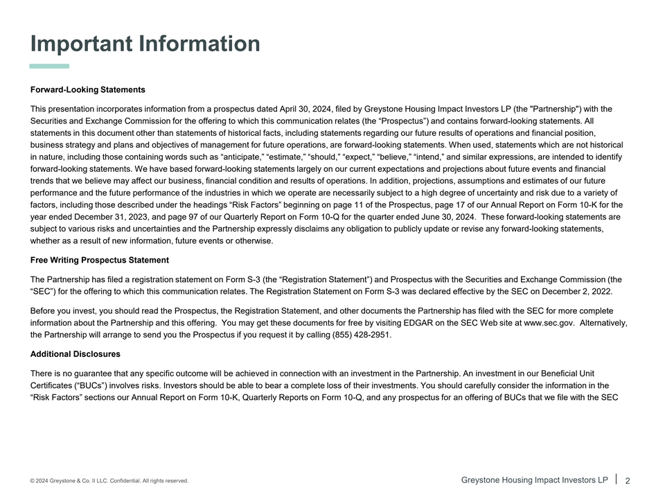 Important Information Forward-Looking Statements This presentation incorporates information from a prospectus dated April 30, 2024, filed by Greystone Housing Impact Investors LP (the Partnership ) with the Securities and Exchange Commission for the offering to which this communication relates (the “Prospectus”) and contains forward-looking statements. All statements in this document other than statements of historical facts, including statements regarding our future results of operations and financial position, business strategy and plans and objectives of management for future operations, are forward-looking statements. When used, statements which are not historical in nature, including those containing words such as “anticipate,” “estimate,” “should,” “expect,” “believe,” “intend,” and similar expressions, are intended to identify forward-looking statements. We have based forward-looking statements largely on our current expectations and projections about future events and financial trends that we believe may affect our business, financial condition and results of operations. In addition, projections, assumptions and estimates of our future performance and the future performance of the industries in which we operate are necessarily subject to a high degree of uncertainty and risk due to a variety of factors, including those described under the headings “Risk Factors” beginning on page 11 of the Prospectus, page 17 of our Annual Report on Form 10-K for the year ended December 31, 2023, and page 97 of our Quarterly Report on Form 10-Q for the quarter ended June 30, 2024. These forward-looking statements are subject to various risks and uncertainties and the Partnership expressly disclaims any obligation to publicly update or revise any forward-looking statements, whether as a result of new information, future events or otherwise. Free Writing Prospectus Statement The Partnership has filed a registration statement on Form S-3 (the “Registration Statement”) and Prospectus with the Securities and Exchange Commission (the “SEC”) for the offering to which this communication relates. The Registration Statement on Form S-3 was declared effective by the SEC on December 2, 2022. Before you invest, you should read the Prospectus, the Registration Statement, and other documents the Partnership has filed with the SEC for more complete information about the Partnership and this offering. You may get these documents for free by visiting EDGAR on the SEC Web site at www.sec.gov. Alternatively, the Partnership will arrange to send you the Prospectus if you request it by calling (855) 428-2951. Additional Disclosures There is no guarantee that any specific outcome will be achieved in connection with an investment in the Partnership. An investment in our Beneficial Unit Certificates (“BUCs”) involves risks. Investors should be able to bear a complete loss of their investments. You should carefully consider the information in the “Risk Factors” sections our Annual Report on Form 10-K, Quarterly Reports on Form 10-Q, and any prospectus for an offering of BUCs that we file with the SEC © 2024 Greystone & Co. II LLC. Confidential. All rights reserved. Greystone Housing Impact Investors LP 2