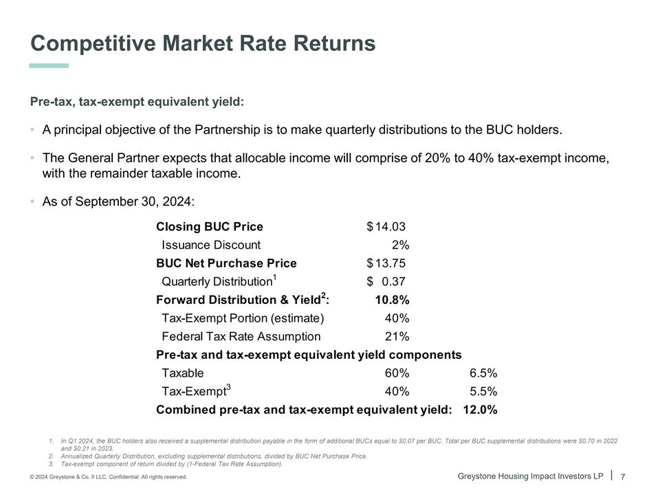 CRA Investment Thesis Community Reinvestment Act Beneficial Unit Certificate (“CRA BUC”): • To provide US depository institutions with an investment opportunity likely to receive positive CRA consideration from regulators, enjoying significant portfolio diversification, and competitive market level returns. • CRA allocations are managed across multiple, portfolio asset level allocation requests, while ensuring no allocation overlap. • The Partnership is required by the LPA to ensure that a majority of the portfolio’s invested assets qualify as public welfare investments as defined in 12 C.F.R. § 24.3. • As of September 30, 2024, approximately $1.1 billion, or around 76%, of the Partnership’s invested assets were identified as community development investments, of which over $1.05 billion were available for allocation. • Identical rights, preferences and transferability as the Partnership's existing BUCs • 2% discount on CRA BUC price at issuance of BUC to previous day closing price. • CRA BUCs will receive the same quarterly distributions, and allocations of income, as BUCs. • CRA BUCs are free to be sold on the NYSE at CRA BUC holders’ determination. © 2024 Greystone & Co. II LLC. Confidential. All rights reserved. Greystone Housing Impact Investors LP 6