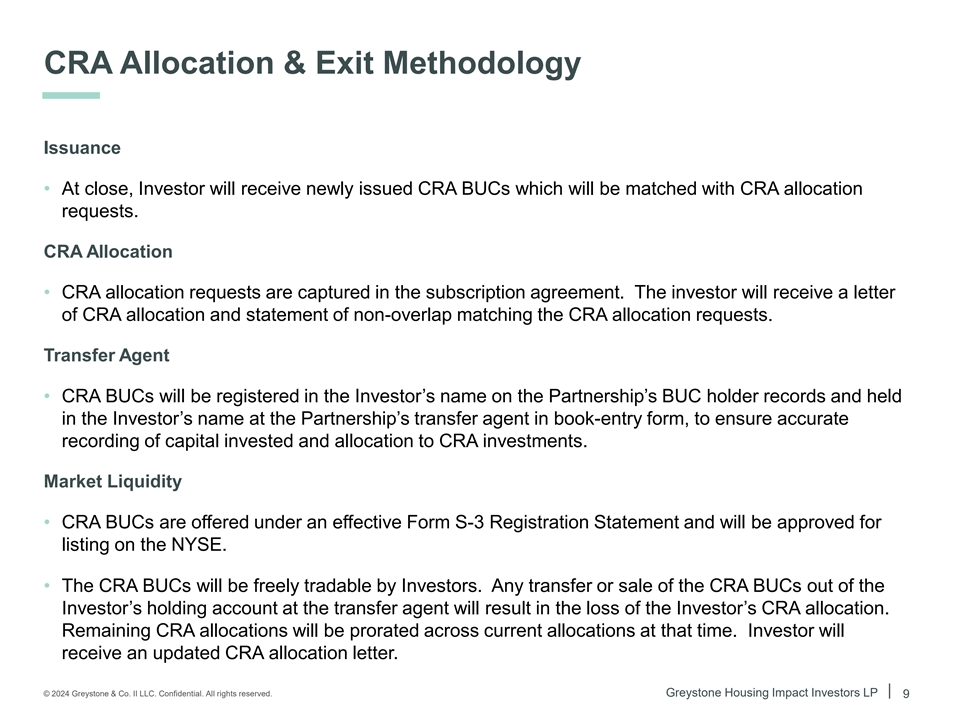Illustrative Issuance • Investor requests an investment in CRA BUCs up to $10,000,000 • CRA BUCs sold at a 2% discount to the closing price of the BUCs on previous trading day as quoted on the NYSE • A whole number of CRA BUCs are issued at the discounted price and Capital Invested is calculated • Investor executes subscription agreement for Capital Invested amount and BUCs are issued with CRA Allocations Target Capital to Invest $10,000,000 1 $14.0300 BUC Price Previous Close Issuance Discount 2% BUC Net Purchase Price $13.7494 2 727,304 Number of BUCs Issued Capital Invested $9,999,994 3 $204,082 Discount Received 4 57,943 30-Day Average Volume Days to Cover 13 1. Close as of September 30, 2024 2. Whole number of BUCs issued 3. BUC Price Previous Close less Net Purchase Price multiplied by Number of BUCs Issued 4. 30-Day Average volume as of September 30, 2024 © 2024 Greystone & Co. II LLC. Confidential. All rights reserved. Greystone Housing Impact Investors LP 8