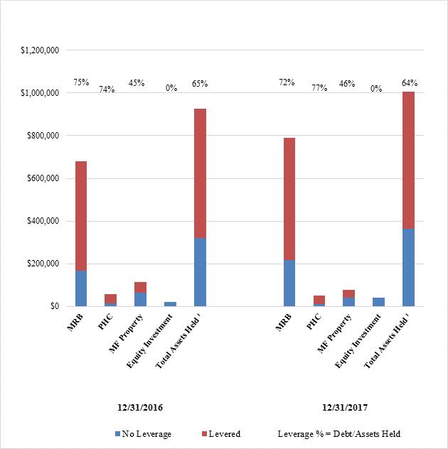 Our overall leverage ratio is calculated as total outstanding debt divided by total partnership assets using the carrying value of the MRBs, PHC Certificates, initial finance costs, and the MF Properties at cost. |
